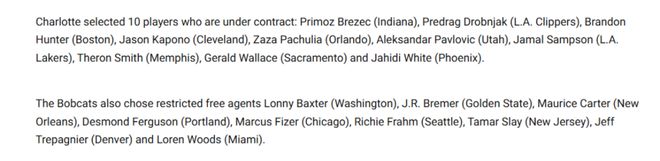 山猫队最终在扩张选秀中,选择了10名有合同在身的球员,和9名受限制自由球员。