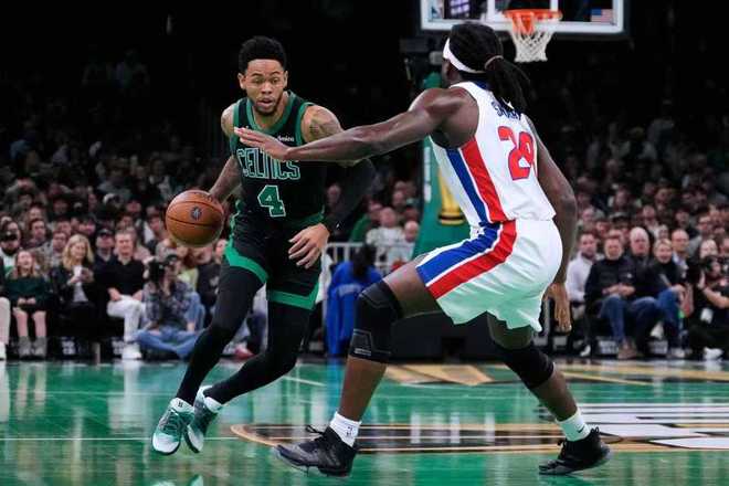 活塞过去13场豪取13连胜稳居东部第一,也追平队史最长连胜纪录,凯尔特人上一场主场138-129战胜魔术。本场活塞缺少萨瑟与克林特曼,凯尔特人缺少塔图姆与科塔。首节开局活塞5-0领先,凯尔特人一波7-0攻势反超比分,活塞回敬一波8-0攻势夺回领先优势。活塞继续被追到15-13领先,坎宁安攻传结合引领一波11-3攻势扩大10分优势,凯尔特人追回4分差距,首节比赛结束活塞30-24领先凯尔特人6分。