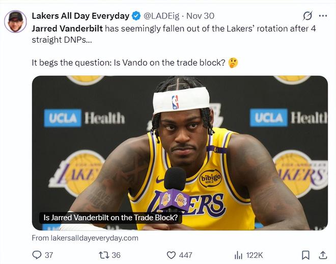 一天之前,湖媒Lakers All Day Everyady发文分析范德比尔特被连续DNP的理由,他最终得出的结论是大概率已经被摆上货架。此役对阵鹈鹕范德彪继续被DNP,他已经连续五场比赛没有得到机会。