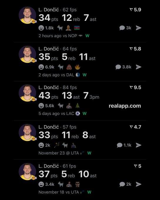 据统计,东契奇已经连续五场比赛拿到两双数据,他成为了沙奎尔-奥尼尔之后首位达成该成就的球员。